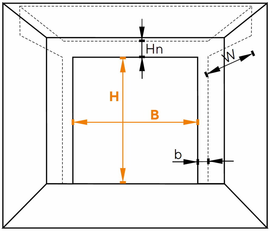 W (profondeur de la construction) : profondeur intérieure nécessaire pour la course de la porte et l’implantation du rail et du moteur. Vérifiez l’absence d’obstacles (poutres, conduits, linteaux traversants) sur la longueur du rail.