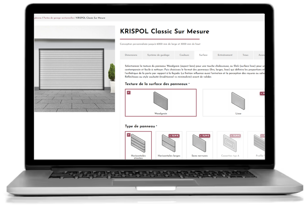 Sur PortaPro, consultez immédiatement le prix de votre configuration et finalisez l’achat de vos portes directement depuis l’interface. Chaque famille de produit — portes de garage, portes d’entrée et accessoires associés — dispose d’un configurateur conçu sur mesure et proposant l’ensemble des options fournies par les fabricants.